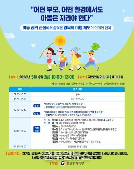 어린이날을 하루 앞두고 개최되는 이번 토론회는 아동권리의 관점에서 양육비 제도의 이행 현황과 개선점을 논의하는 자리로, 4인의 국회의원과 (사)양육비해결총연합회, (사)칸나희망서포터즈, (사)한국여성변호사회, 한국가족법학회, 한국아동단체협의회가 공동주최하고, 성평등가족부가 후원 기관으로 참여한다.
