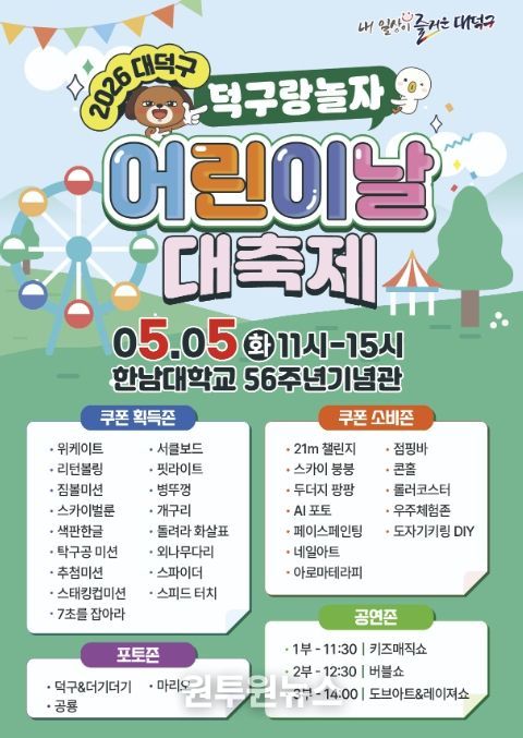(원투원뉴스) 대전 대덕구는 제104회 어린이날을 맞아 아동과 가족이 함께 즐길 수 있는 ‘덕구랑 놀자! 대덕구 어린이날 대축제’를 개최한다고 밝혔다.