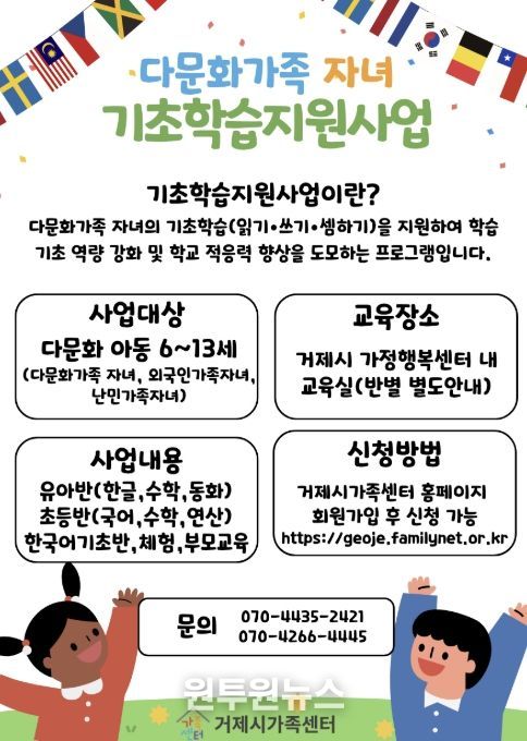 (원투원뉴스) 거제시가족센터는 다문화가족 자녀의 학교생활 적응과 기초학습 능력 향상을 위해 ‘다문화가족 자녀 기초학습지원 사업’을 운영하고 있다.