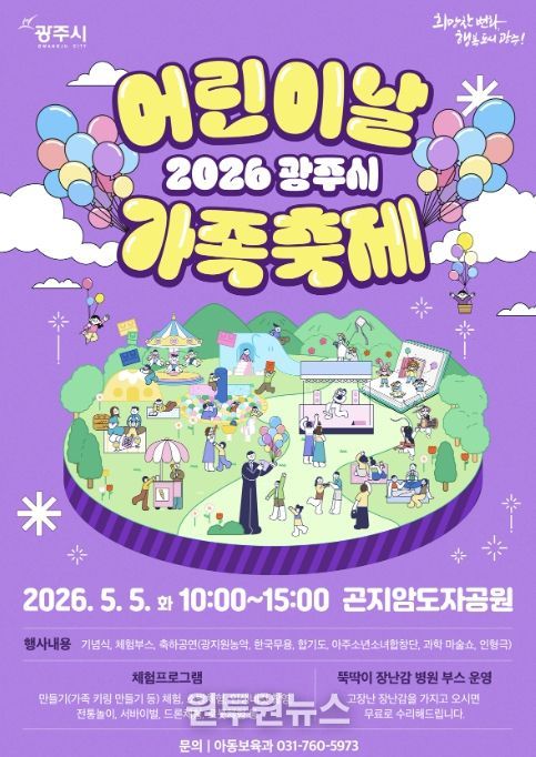 (원투원뉴스) 광주시는 제104회 어린이날을 맞아 오는 5월 5일 오전 10시 곤지암도자공원에서 ‘어린이날 가족축제’를 개최한다.