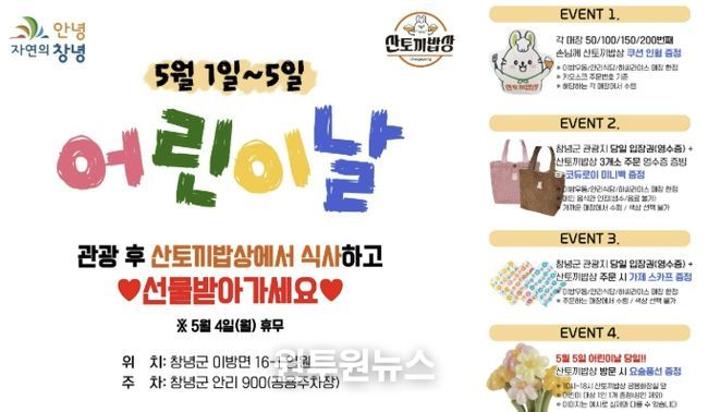 어린이날을 맞아 5월 1일부터 5일까지(4일 휴무) 관내 관광지 입장권과 산토끼밥상 주문 영수증을 제시하면 다양한 선물도 받을 수 있다.