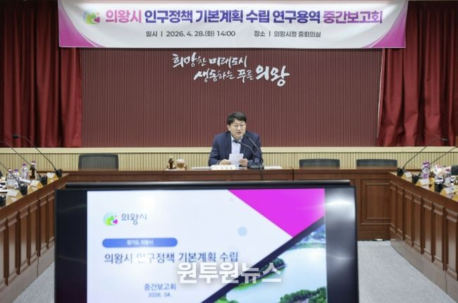 (원투원뉴스) 의왕시는 4월 28일 시청 중회의실에서 '인구정책 기본계획 수립 연구용역 중간보고회'를 개최하고, 의왕시 맞춤형 인구정책 방향을 논의했다.