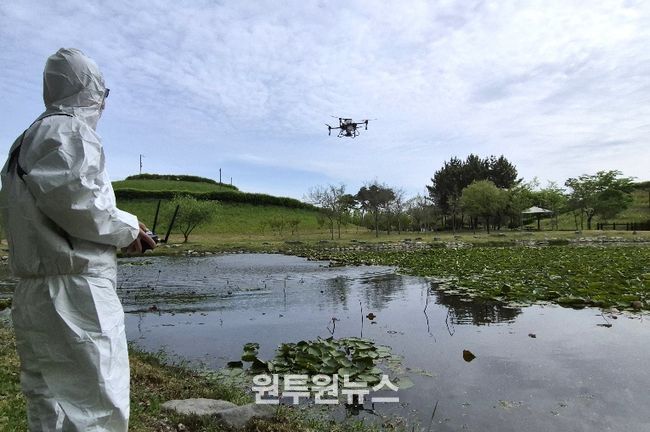 (원투원뉴스) 전남 나주시는 친환경 방역 약품과 첨단 드론 기술을 활용해 인력 접근이 어려운 호수공원 수면 등 방역 사각지대를 해소하고 시민들에게 쾌적한 환경을 제공하기 위해 드론 방역사업을 추진한다.