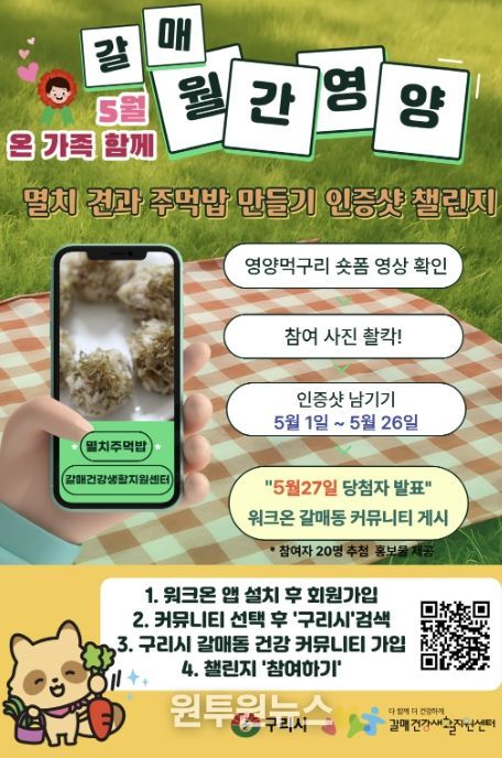 (원투원뉴스) 구리시 갈매건강생활지원센터는 오는 5월 1일부터 5월 26일까지 주민 주도형 식습관 개선 사업의 일환으로 ‘우리 가족 뼈 건강 지킴이! 멸치 견과 주먹밥 만들기 인증 사진 참여 잇기(챌린지)’를 추진한다고 밝혔다.