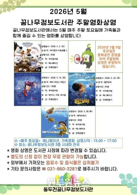 도서관 관계자는 "5월에 도서관에서 재미있는 영화를 보며 아이와 부모가 함께 유쾌하고 즐거운 시간을 보내길 바란다”라고 말했다.