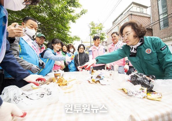 박 구청장은 이날 한남동 주민센터를 시작으로 카페거리 일대에서 주민 70여 명과 함께 청소에 참여했다. 특히 매월 클린데이와 함께 진행되는 ‘종량제 봉투 파봉 캠페인’에서 일일 강사로 나서 직접 종량제 봉투를 열어 보이며 분리배출의 중요성을 강조했다.