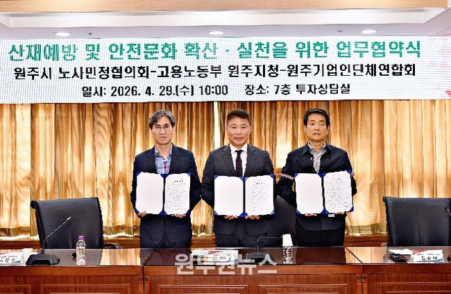 이번 협약은 지역 노사민정 상생협력 사업의 일환인 ‘2026년 찾아가는 小사업장 산재예방 교육’ 추진을 위한 기관 간 업무협약이다. 협약에는 원주시 노사민정협의회와 고용노동부 원주지청, 원주기업인단체연합회가 참여해 안전 문화 확산을 위한 적극적인 지원과 협조를 약속했다.