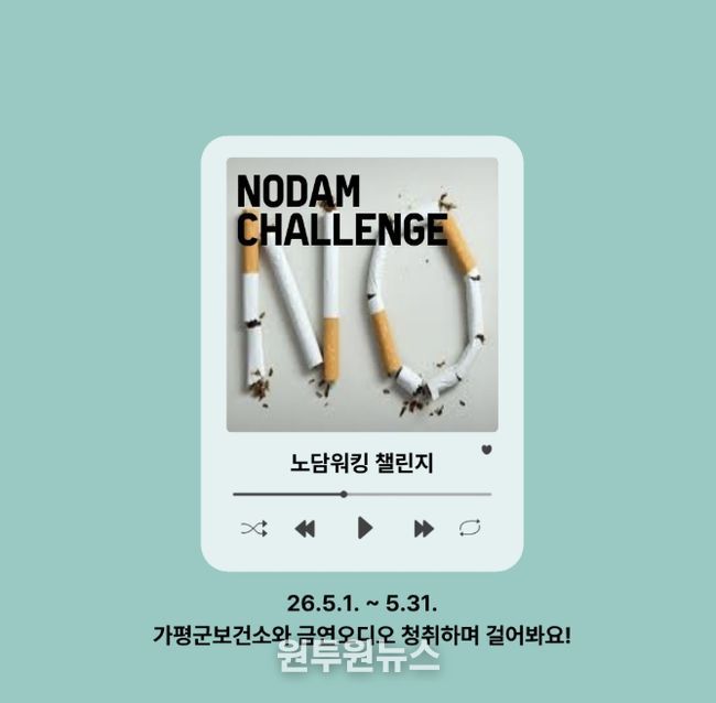 (원투원뉴스) 가평군보건소가 ‘세계 금연의 날’을 앞두고 5월 1일부터 한 달간 금연 인식 확산을 위한 ‘노담워킹 챌린지’를 진행한다. 이번 행사는 일상 속 걷기 실천과 금연 홍보를 병행해 군민들의 건강한 생활 습관 형성을 돕고자 마련됐다.