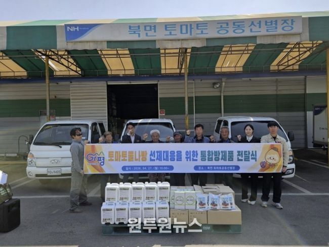 (원투원뉴스) 가평군은 최근 북면 토마토 공동선별장에서 토마토 뿔나방 예방을 위한 통합방제물품 전달식을 가졌다.