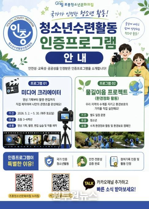 조종청소년문화의집 관계자는 “이번 인증은 프로그램의 질적 수준과 공신력을 확보한 중요한 계기”라며 “앞으로도 청소년이 주도적으로 성장할 수 있는 다양한 프로그램을 개발하겠다”고 밝혔다.