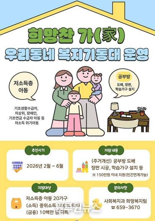 (원투원뉴스) 여수시는 저소득층 아동의 학습 여건 개선과 안전한 주거공간 조성을 위해 2026년 주거환경 개선사업 ‘희망찬 가(家)’를 추진한다고 밝혔다.