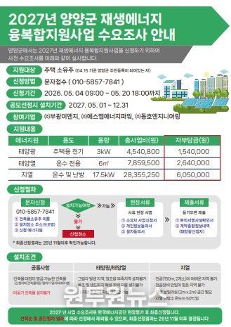 (원투원뉴스) 양양군이 에너지 비용 절감과 온실가스 감축을 위한 ‘2027년 신재생에너지 융복합지원사업’ 공모 신청을 위해 오는 5월 4일부터 20일까지 사업 참여 희망자를 모집한다.