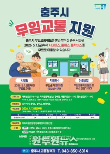 (원투원뉴스) 충주시가 교통약자의 이동 편의를 높이고 사회활동 참여를 독려하기 위해 오는 5월 1일부터 ‘충주시 어르신 등 무임교통 지원 사업’을 전격 시행한다고 밝혔다.