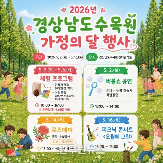 (원투원뉴스) 경상남도산림환경연구원은 가정의 달 5월을 맞아 오는 5월 2일부터 16일까지 경상남도수목원 잔디원 일원에서 가족 단위 방문객을 위한 체험·공연·나눔 행사를 운영한다고 밝혔다.