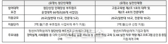 첫째, 첨단인재형은 기존 첨단산업 인재양성 부트캠프 운영 대학의 지원대상을 비재학생 청년까지 확대하는 유형으로, 20개교(일반대 15개교, 전문대 5개교)를 선정할 계획이다. 인공지능(AI), 반도체, 이차전지, 디스플레이, 바이오, 항공우주, 미래차, 로봇 등 첨단산업 분야를 중심으로, 기존의 교육 기반과 대학-기업 협력체계를 활용하여 청년의 첨단분야 실무 역량을 높일 계획이다.