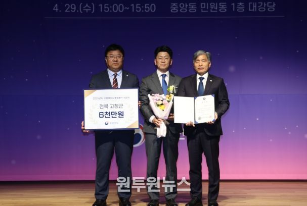 (원투원뉴스) 고창군이 29일 정부세종청사에서 열린 ‘2025년 민원서비스 종합평가 시상식’에서 행정안전부장관 기관 표창을 수상하고 인센티브로 특별교부세 6000만원을 확보했다고 밝혔다.