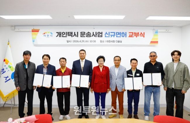 (원투원뉴스) 이천시는 29일 시청 다올실에서 개인택시운송사업 신규 면허증 교부식을 개최하고, 심사를 통해 최종 선정된 5명의 대상자에게 면허증을 전달했다고 밝혔다.