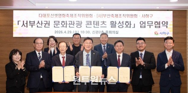 (원투원뉴스) 부산 사하구는 서부산권에서 개최되는 축제 및 문화 행사를 중심으로 지역 문화관광 콘텐츠의 발전 가능성을 함께 모색하고 지속가능한 협력 기반을 마련하기 위해 4월 29일 다대포선셋영화축제조직위원회, 부산축제조직위원회와 업무협약을 체결했다고 밝혔다.