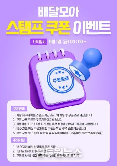 (원투원뉴스) 제천시는 공공배달앱 ‘배달모아’ 이용 고객을 대상으로 5월 1일부터 ‘스탬프 쿠폰 이벤트’를 진행한다.