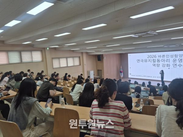 (원투원뉴스) 충남교육청은 29일, 충청남도교육청교육연수원(공주)에서 2026학년도 ‘바른 인성 함양 연극・뮤지컬 지도교사 배움자리’를 개최했다. 이날 행사는 도내 초중고 연극·뮤지컬 동아리 지도교사 80여 명을 비롯해 14개 교육지원청 담당 장학사, 충남교육연극협회 운영진 등 총 120여 명이 참석했다.