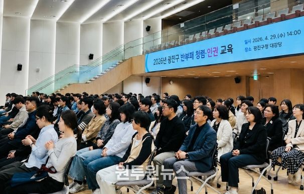 (원투원뉴스) 광진구가 4월 29일 광진구청 대강당에서 공직윤리 확립과 상호 존중하는 조직문화 조성을 위한 ‘반부패 청렴·인권 교육’을 실시했다.