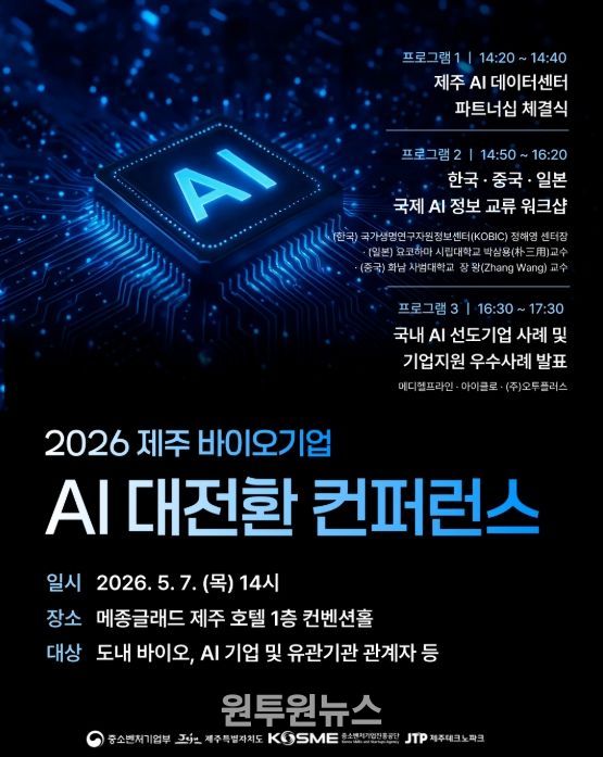 (원투원뉴스) 제주테크노파크(원장 지영흔, 제주TP)는 오는 5월 7일 오후 2시 메종글래드 제주 호텔에서 도내외 바이오 및 AI 산업 관계자 100여 명을 대상으로 ‘제주 바이오기업 AI 대전환(DX) 컨퍼런스’를 개최한다고 30일 밝혔다.