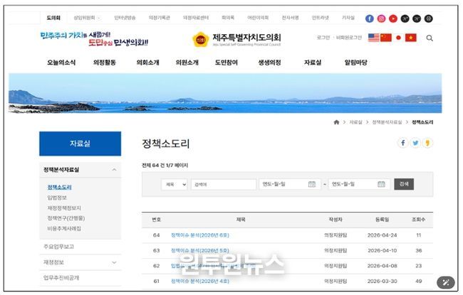 (원투원뉴스) 제주특별자치도의회는 입법 및 정책 동향 등 주요 현안에 대한 최신 정보를 도민에게 신속히 제공하기 위하여 '정책 소도리'를 운영하고 있다고 밝혔다.