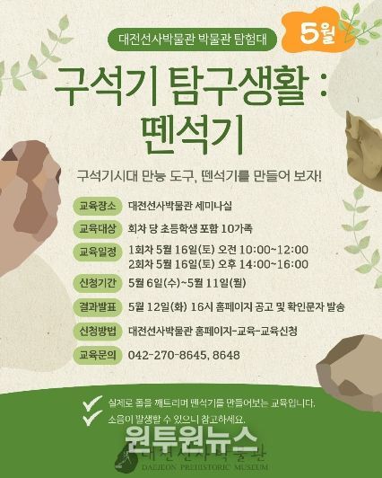 (원투원뉴스) 대전선사박물관은 5월 가정의 달과 ‘박물관·미술관 주간(Museum Week)’을 맞아 온 가족이 함께 즐길 수 있는 다양한 선사 문화 체험 프로그램을 운영한다.