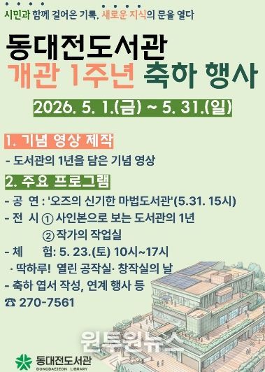(원투원뉴스) 동대전도서관은 5월 1일부터 31일까지 개관 1주년을 맞아 시민과 함께한 지난 1년의 발자취를 돌아보고 다양한 기념행사를 개최한다.