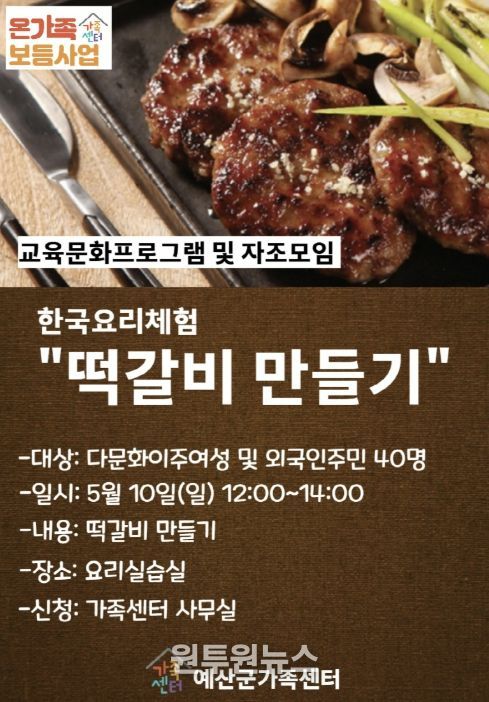 (원투원뉴스) 예산군가족센터는 지역 내 결혼이주여성과 외국인 주민의 한국문화 이해 증진과 안정적인 정착 지원을 위해 오는 5월 10일 한국전통요리 체험 ‘떡갈비 만들기’ 프로그램을 운영한다고 밝혔다.