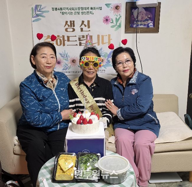 (원투원뉴스) 서울 성북구 정릉4동 지역사회보장협의체가 4월 특화사업 ‘찾아가는 은빛 생신잔치’를 처음 추진하고 관내 독거어르신 가정을 방문해 생신을 축하했다.