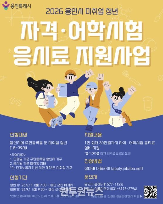 (원투원뉴스) 용인특례시는 취업을 위해 어학과 자격증 시험 등을 준비 중인 청년을 위해 응시료 30만 원을 지원한다고 30일 밝혔다.