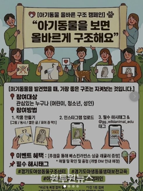 경기도는 어린이를 대상으로 시행하는 ‘야생동물 생태보전교육’에서도 자칫 납치가 될 수 있는 야생동물 구조에 대한 내용을 교육하고 있다. 또 ‘아기동물을 보면 올바르게 구조해요’라는 캠페인을 병행해 미래 세대가 야생동물의 생태적 특성을 이해하고, 인위적 개입을 줄여 자연과 공존하는 삶을 영위할 수 있도록 지속적으로 노력하고 있다.