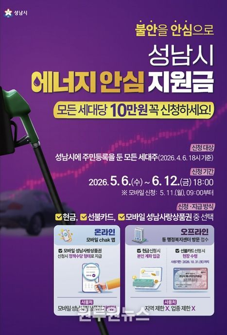 (원투원뉴스) 성남시는 중동 사태에 따른 국가 자원안보 위기 경보 발령으로 경제적 부담이 커진 시민들을 지원하기 위해 전국 최초로 ‘성남시 에너지 안심지원금’을 오는 5월 6일부터 신청을 받는다고 밝혔다.