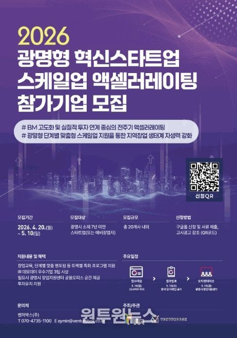 시는 오는 5월 10일까지 ‘2026년 광명형 혁신스타트업 스케일업 액셀러레이팅’ 참가기업을 모집한다.