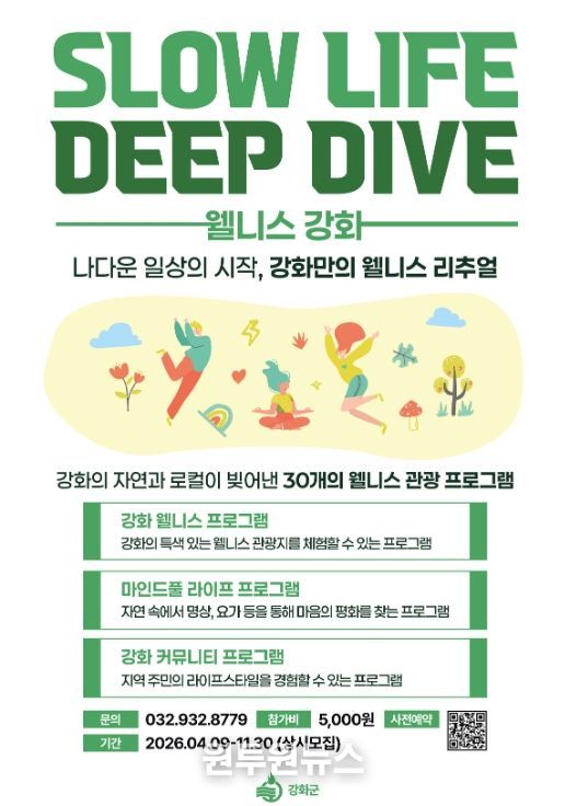 군 관계자는 “이번 웰니스 프로그램은 강화의 자연과 고유의 매력을 바탕으로 관광객에게 진정한 쉼과 치유의 경험을 제공하기 위해 마련됐다”며 “앞으로도 강화만의 특색을 살린 웰니스 관광 콘텐츠를 지속적으로 확대해 지역 관광 활성화에 힘쓰겠다”고 말했다.