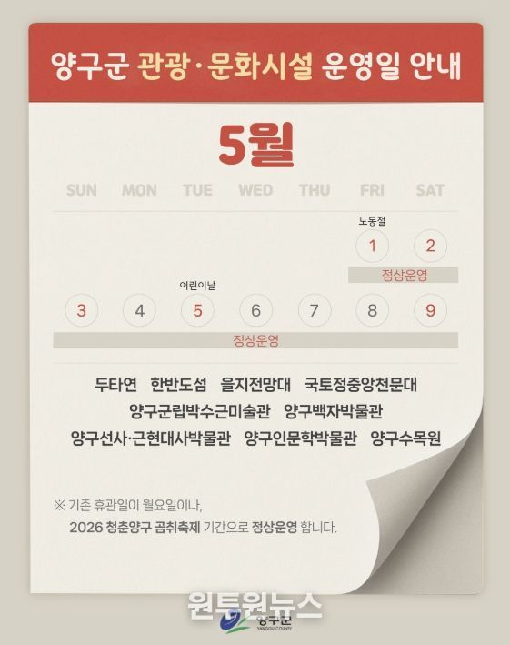 (원투원뉴스) 양구군은 ‘2026 청춘양구 곰취축제’ 기간 동안 관광객 편의 증진과 지역 관광 활성화를 위해 관내 주요 관광·문화시설을 휴관일 없이 정상 운영한다.