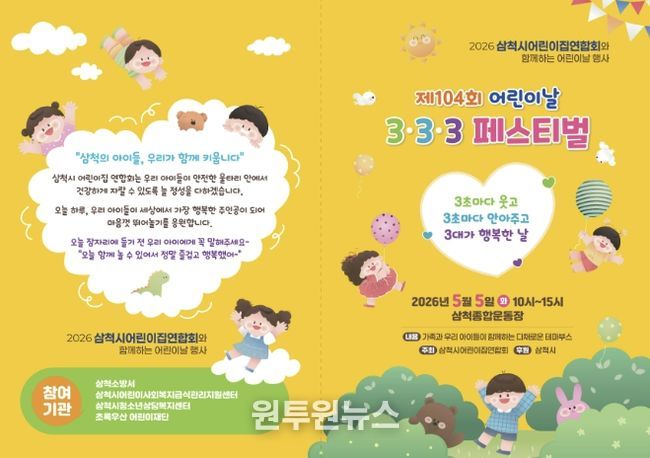 먼저 어린이날인 5월 5일 삼척시어린이집연합회 주관으로 삼척 종합운동장에서 “3초마다 웃고 3초마다 안아주고 3대가 행복한 날”이라는 주제로 ‘제104회 어린이날 3ㆍ3ㆍ3 페스티벌’을 개최한다.