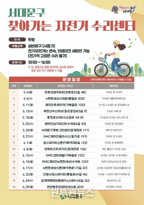 (원투원뉴스) 서대문구가 주민들의 자전거 이용 활성화와 안전한 운행을 위해 5∼6월과 9∼11월 ‘찾아가는 자전거 수리센터’를 총 32회 운영한다.