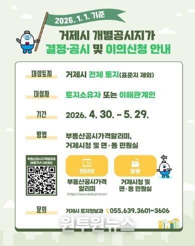 (원투원뉴스) 거제시는 2026년 1월 1일 기준 개별공시지가를 4월 30일 결정·공시하고 오는 5월 29일까지 이의신청을 받는다고 밝혔다.