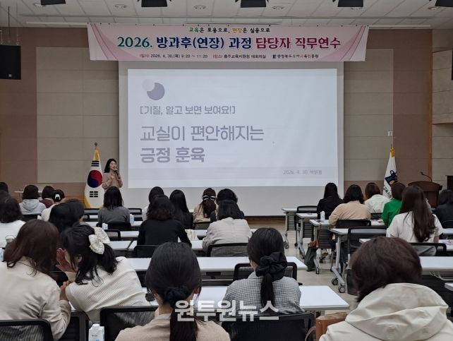 (원투원뉴스) 충청북도교육청 직속기관 유아교육진흥원(원장 박연숙)은 30일, 충주교육지원청 대회의실에서 도내 유치원‧어린이집 방과후(연장) 과정 담당자를 대상으로 '2026. 방과후(연장) 과정 담당자 직무연수'를 운영했다.