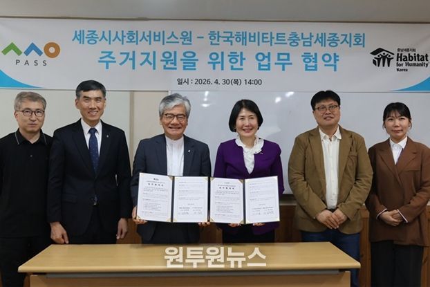 (원투원뉴스) 세종시사회서비스원은 4월 30일 한국해비타트 충남세종지회(이사장 윤학희)와 사회적 가치 실현을 위한 업무협약을 체결했다고 밝혔다.