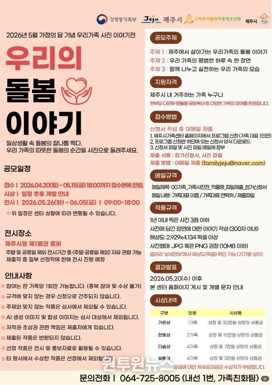 접수 기간은 5월 15일까지이며, 심사를 통해 선정된 11가족에게는 상장과 상품권이 수여된다. 선정작은 5월 26일부터 6월 5일까지 제주시청 제1별관 로비에 전시될 예정이다.