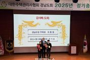 (원투원뉴스) 대한주택관리사협회 경남도회는 어제(11월 27일) 창원축구센터 대세미나실에서 2025년 정기총회를 열고 공동주택 관리 발전에 기여한 공로로 경상남도 및 양산시, 올해 우수 주택관리사와 공로자 등 20여명에 대해 표창 및 감사패를 수여했다. 대한주택관리사협회는 양산시의 공동주택 행정의 체계적 개선 노력을 인정해 변기호 공동주택과장에게 감사패를 수여했다. 협회는 공동주택 거주비율이 80%를 넘는 지역 특성에 맞춰 시가 지속적으로 관리 역량을 강화해 온 점을 높게 평가했다. 양산시는 관리주체를 대상으로 한 직무교육을 정례화해 관리 전문성을 높이고 경남도 내 지자체 최초로 공동주택관리지원센터팀을 신설해 직접 찾아가는 컨설팅을 확대했으며, 분야별 전문가로 구성된 자문단을 운영해 현장 맞춤형 지원을 제공했다. 또 관리 전반의 투명성 강화를 위해 공동주택 관리 감사제도를 적극 활용해 공동주택 내 예산집행, 입주자대표회의 운영 등 핵심 영역을 점검해 분쟁을 예방하고 단지별 관리 수준을 끌어올리는데 기여하고 감사 결과를 토대로 개선이 필요한 단지에는 추가 컨설팅을 연계해 문제해결을 지원했다. &nbs