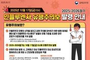(원투원뉴스) 광명시는 최근 인플루엔자 환자가 빠르게 증가함에 따라 시민들에게 예방접종과 개인예방수칙 준수를 재차 당부했다. 28일 시에 따르면 올해 44주차(10월 26일~11월 1일)부터 47주차(11월 16~21일) 인플루엔자 의사환자 분율(인플루엔자 의사환자 수/총 진료 환자 수)은 외래환자 1천 명당 ▲22.8명 ▲50.7명 ▲66.3명 ▲70.9명으로 4주 연속 크게 상승했다. 올해 유행 시기가 예년보다 앞당겨지면서 지난 10월 17일 인플루엔자 유행주의보 발령 이후 감염 위험이 빠르게 높아지고 있다. 시는 특히 ▲소아 ▲임신부 ▲65세 이상 어르신 ▲면역저하자 등 고위험군은 가까운 위탁의료기관에서 신속히 접종을 받을 것을 권고했다. 또한 감염 확산을 줄이기 위해서는 손 씻기와 마스크 착용 등 기본적인 예방수칙을 지키고, 발열·기침 등 의심 증상이 있을 경우 즉시 의료기관을 방문해 진료받는 것이 바람직하다. 박선미 감염병관리과장은 “올해 인플루엔자 유행이 평년보다 빨라 주의가 더욱 필요한 시기”라며 “특히 고위험군은 서둘러 예방접종을 받고, 개인위생 수칙을 철저히 지켜달라”고
