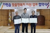 (원투원뉴스) 가평군 가평읍 행정복지센터는 최근 가평읍지역사회보장협의체(지사협), 유일닭강정과 ‘맞춤형복지 지원 업무협약’을 체결했다. 이번 협약으로 유일닭강정은 매월 가평읍 맞춤형복지팀에서 추천한 저소득계층 10가정에 닭강정을 지원해 주기로 했다. 장석조 가평읍장은 “복지사각지대 발굴뿐 아니라 민간 자원 연계가 복지 수준을 높이는 데 큰 역할을 한다”며 “이번 협약이 공공자원만으로는 충족하기 어려웠던 복지수요를 보완하는 데 큰 도움이 될 것”이라고 말했다. 유병훈 유일닭강정 대표는 “우리 지역 주민들과 마음을 나누고 싶어 맞춤형복지 지원 협약에 참여했다”며 “앞으로도 어려운 이웃을 위한 나눔과 봉사를 꾸준히 실천하겠다”고 밝혔다.