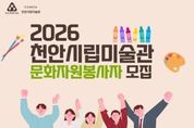 (원투원뉴스) (재)천안문화재단은 오는 19~ 30일 천안시립미술관 문화자원봉사자를 모집한다고 14일 밝혔다. 문화자원봉사자로 선발되면 오는 3월부터 내년 2월까지 관람 안내, 전시·교육·행사 지원 등의 활동을 하게 되며, 봉사실적 인정, 기초·전문 교육, 소정의 활동비 지급 등의 혜택이 제공된다. 모집 대상은 문화예술에 관심이 있는 20세 이상 성인으로, 1차 서류 심사와 2차 인터뷰 심사 등을 통해 내달 30명 내외를 선발할 예정이다. 지원 신청은 천안시립미술관 누리집에 게재된 공고문을 확인한 후 신청서 양식을 내려받아 담당자 이메일로 접수하면 된다. 자세한 사항은 천안시립미술관 누리집을 참고하거나 시각예술팀으로 문의하면 된다.