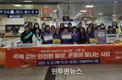(원투원뉴스) 의정부시는 여성폭력 추방주간(11월 25일~12월 1일)을 맞아 11월 27일 의정부역사 3층에서 ‘여성 폭력 근절 캠페인’을 실시했다. 이번 캠페인에는 여성긴급전화1366 경기북부센터, 성폭력피해자 보호시설 의정부시 사랑의 쉼터, (사)사랑깊은뜰 경기북부가정문제상담소, 의정부장애인성폭력상담소, 성매매피해상담소 두레방, 여성친화도시 시민서포터즈(여의주) 등 유관기관 및 단체의 20여 명이 참여했고 많은 시민이 캠페인의 필요성을 공감했다. 여성폭력 추방주간은 폭력없는 사회를 위해 여성폭력 방지의 의미를 되새기는 기간으로 매년 11월 25일부터 12월 1일까지 운영하고 있다. 특히, 11월 25일은 UN이 정한 ‘세계 여성폭력 추방의 날’이기도 하다. 이날 캠페인에서는 ‘폭력 없는 안전한 일상, 존중이 빛나는 사회’를 주제로, 여성폭력 근절을 위한 서명운동 및 여성폭력 피해자 지원기관 안내를 비롯한 다양한 활동을 실시하며 여성폭력 방지의 의미를 되새기는 시간을 가졌다. 김동근 시장은 “향후에도 폭력 예방과 근절, 피해자 보호 및 지원에 대한 지속적인 홍보를 통해 안전한 사회분위기 조성에