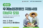 (원투원뉴스) 사천시가 오는 2월 11일까지 2026년 후계농업경영인 육성사업 대상자를 모집한다고 14일 밝혔다. 신청 자격은 사천시에 거주하는 만 18세 이상 50세 미만의 예비농업인으로, 독립 경영 경험이 10년 미만이거나 독립 경영 예정자이며, 병역을 필하거나 면제된 사람이다. 사업 신청은 처세대농림사업정보시스템(농업e지)을 통해 온라인으로 가능하며, 서류 평가와 평가 검증을 거쳐 2026년 4월 중 최종 결과가 발표될 예정이다. 후계농업경영인 육성사업은 선정된 농업인에게 최대 5억원의 융자 지원을 제공하고, 선정된 후계농의 영농 경영 및 역량강화를 위한 교육프로그램도 지원한다. 자세한 사항은 사천시 홈페이지에 게시된 시행 지침을 참고하거나, 사천시 미래농업과 인력육성팀으로 문의하면 된다. 박동식 시장은 "미래 농업을 이끌어 갈 후계농업경영인들이 본 지원사업을 적극 활용해 안정적으로 영농에 정착할 수 있도록 최선을 다해 지원하겠다"고 말했다.