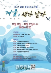 (원투원뉴스) 고양특례시는 겨울철의 아름다움과 생태적 가치를 경험할 수 있는 프로그램인 ‘겨울, 새가 날다’를 오는 21일부터 12월 20일까지 진행한다 이 프로그램은 철새를 주제로 한 DMZ 평화의 길 쉼터 특별 프로그램으로 매주 금요일과 토요일에 운영되며 겨울 철새의 생태를 이해하고 자연과의 교감을 통해 평화의 가치를 되새기는 기회를 제공하고자 마련됐다. 참가자들은 장항습지탐조대에서 람사르장항습지를 찾는 겨울 철새들을 관찰하고 새 밥 짓기 체험활동과 철책길 걷기, DMZ 평화의 길 쉼터(나들라온) 탐방을 통해 DMZ 접경지역의 역사적 의미와 생태적 중요성을 되새기는 시간을 갖는다. 프로그램 신청은 6일부터 ‘겨울, 새가 날다’ 네이버 예약사이트를 통해 가능하며, 선착순으로 모집한다. 시 관계자는 “이번 프로그램은 가족 단위의 참가자 및 자연에 관심 있는 모두에게 열려 있으니 특별한 환경 속에서 철새를 관찰하고, 그들과의 소통을 통해 더욱 깊이 있는 경험을 누려보시기 바란다”라고 밝혔다.